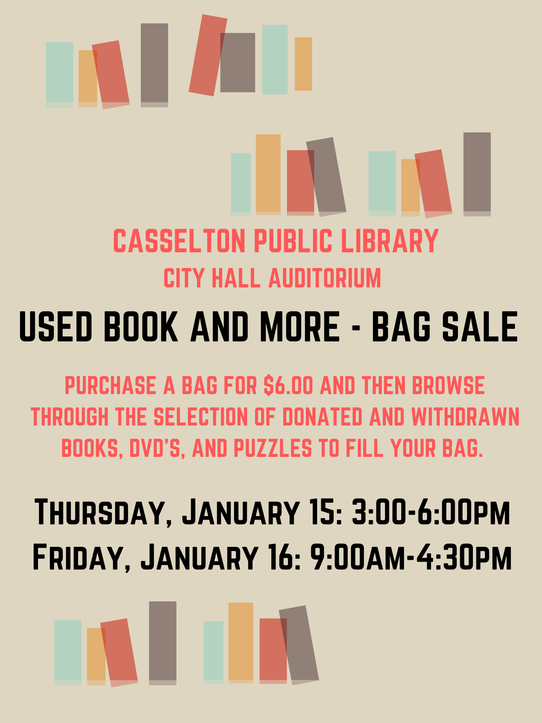 2. We now have a few shelves that are in need of organizing. Contact the library if you are interested. 347-6292 or cassndlibrary@casselton.net.