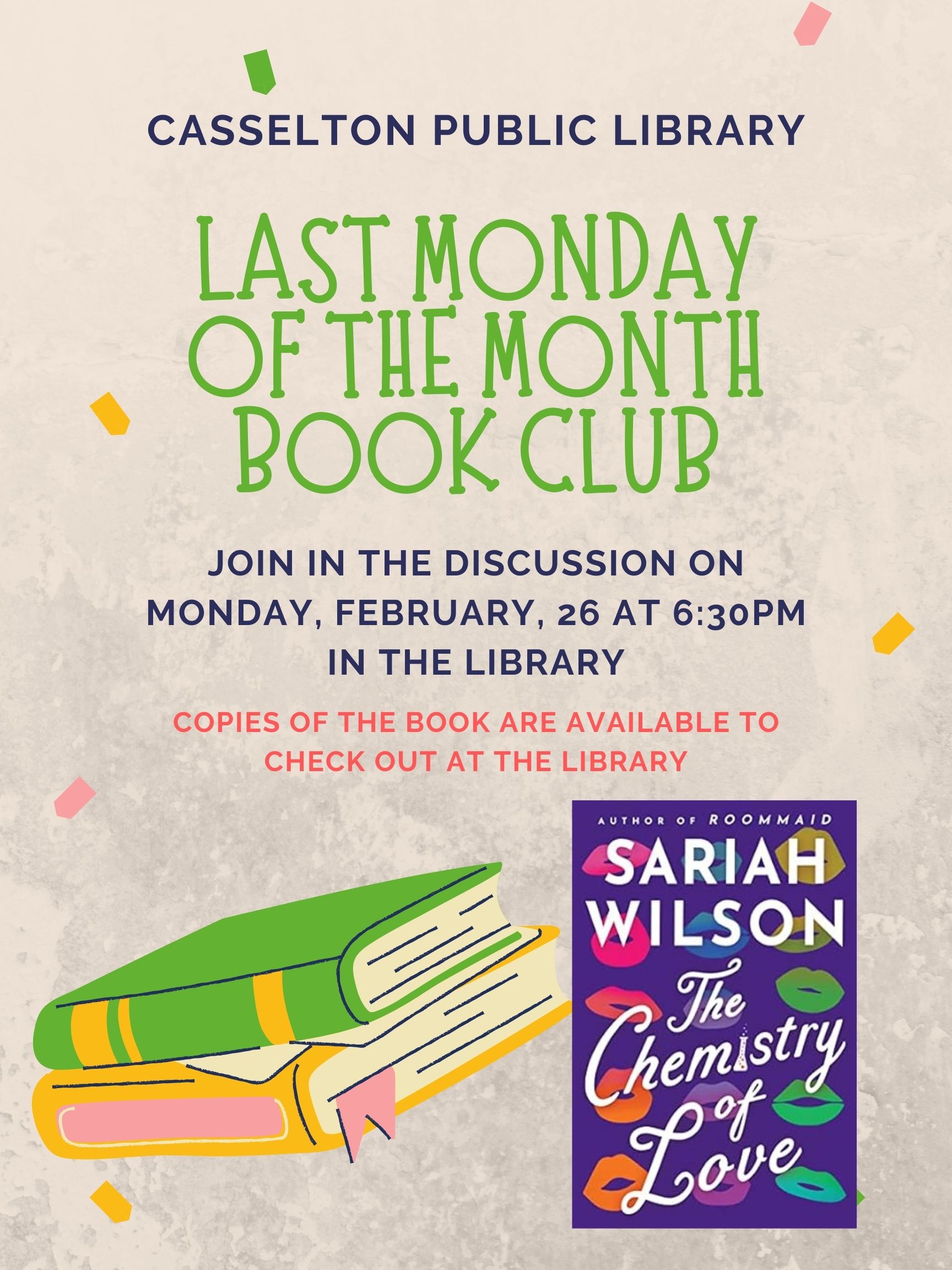 AdultsLast Monday of the Month Book Club January 30, 2024 cassndlibrary Share: Click to email a link to a friend (Opens in new window) Email TweetLike Loading... Related Published by cassndlibrary View all posts by cassndlibrary