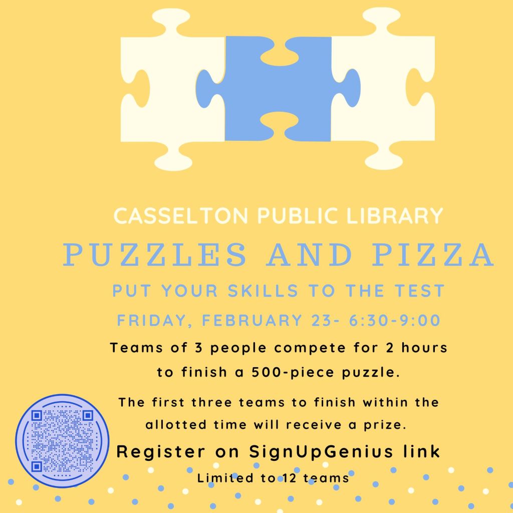 FamilyPuzzle and Pizza February 1, 2024February 1, 2024 cassndlibrary xr:d:DADyIGeJxRc:138,j:4138099488954067907,t:24020115 Share: Click to email a link to a friend (Opens in new window) Email TweetLike Loading... Related Published by cassndlibrary View all posts by cassndlibrary
