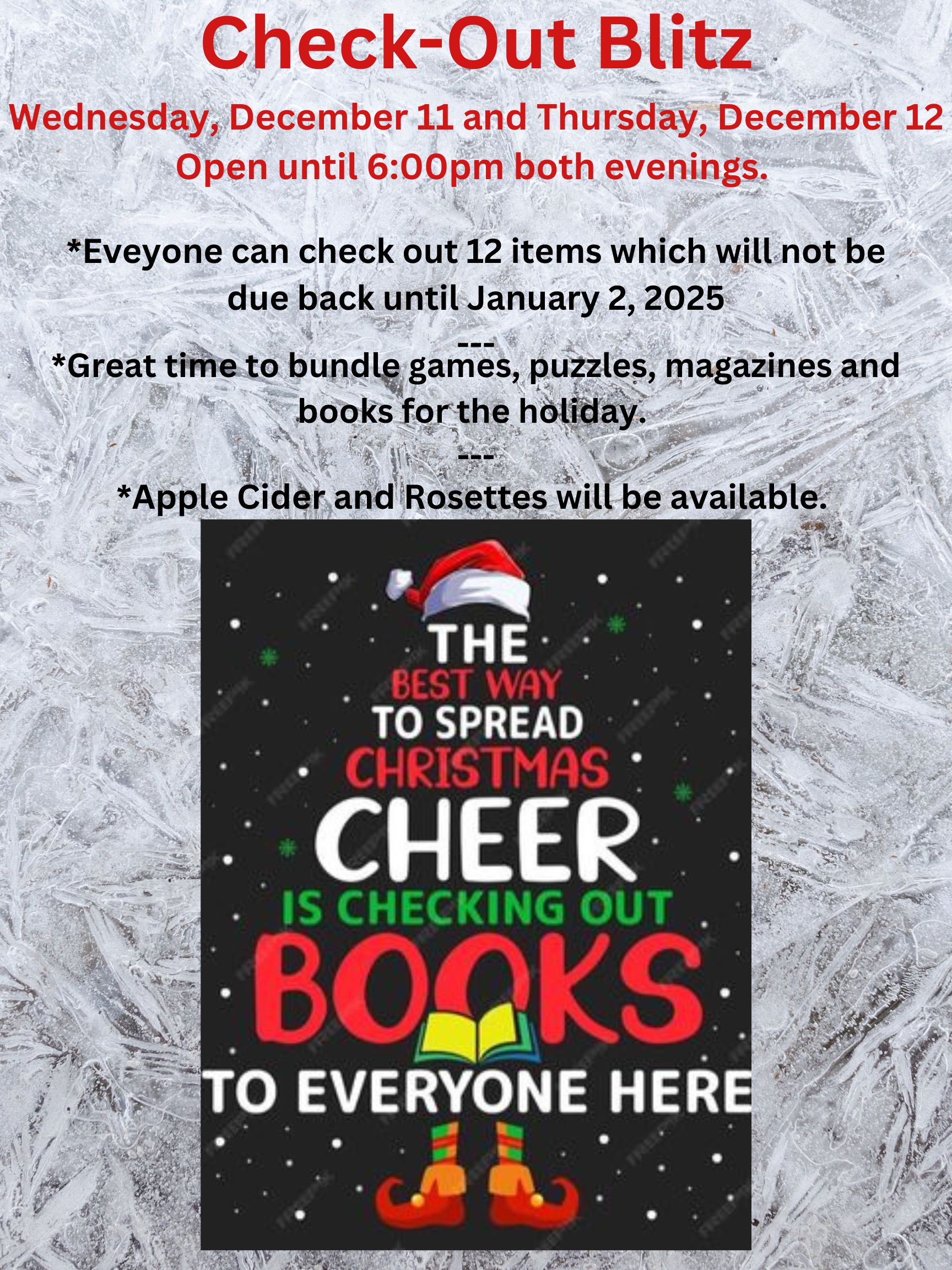 FamilyCheck-Out Blitz November 25, 2024 cassndlibrary Share: Click to email a link to a friend (Opens in new window) Email TweetLike Loading... Related Published by cassndlibrary View all posts by cassndlibrary